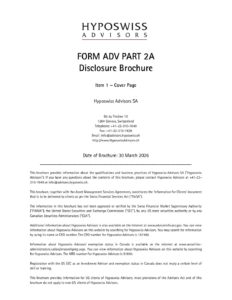 Hyposwiss Advisors SA does not provide investment advice, or any legal, tax, financial or other advice through this Website. You may not rely on the information on this Website, including any documents downloaded from this Website, as investment advice. You should not base any investment decision on the information or opinions expressed on this Website. The materials